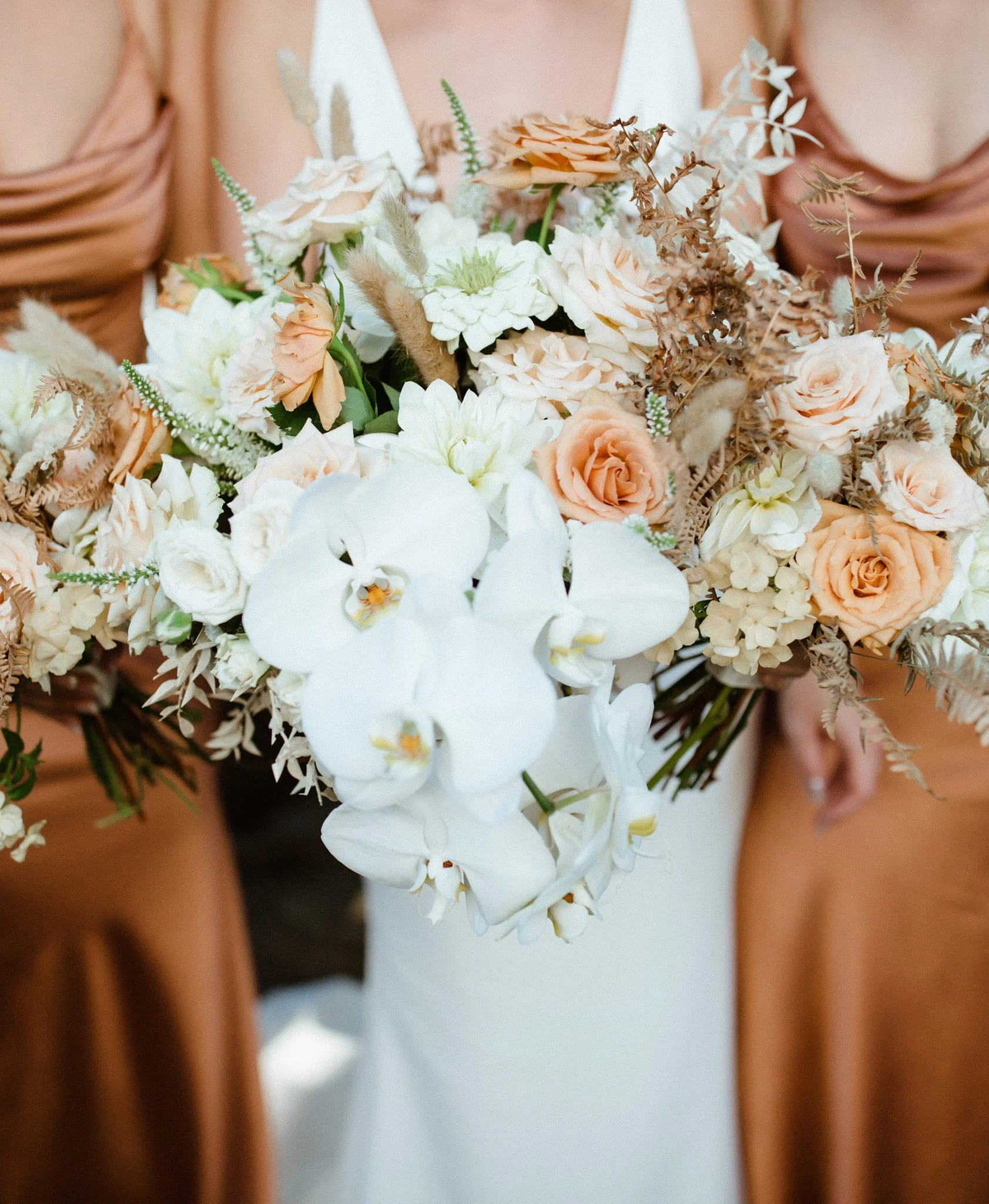 Robert and Rosie’s wedding flowers were a stunning mix of fresh and dried florals in a neutral color palette with a surprise twist of bright white orchids. They curated a phenomenal keepsake collection, including the classic bookends wedding bouquet preservation, the circle wedding party artworks, the set of 2 pyramid ring holders, and gold earrings. For the wedding party artworks, they also sent the Maid of Honor and bridesmaid’s bouquets so they could give the keepsakes as gifts. Clients are always welcome to provide us with additional bouquets to make special keepsakes with - the more, the merrier!